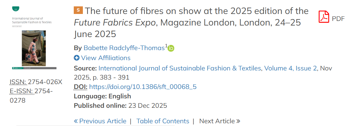 The future of fibres on show at the 2025 edition of the Future Fabrics Expo, Magazine London, London, 24–25 June 2025, In In International Journal of Sustainable Fashion & Textiles, Volume 4, Issue 2